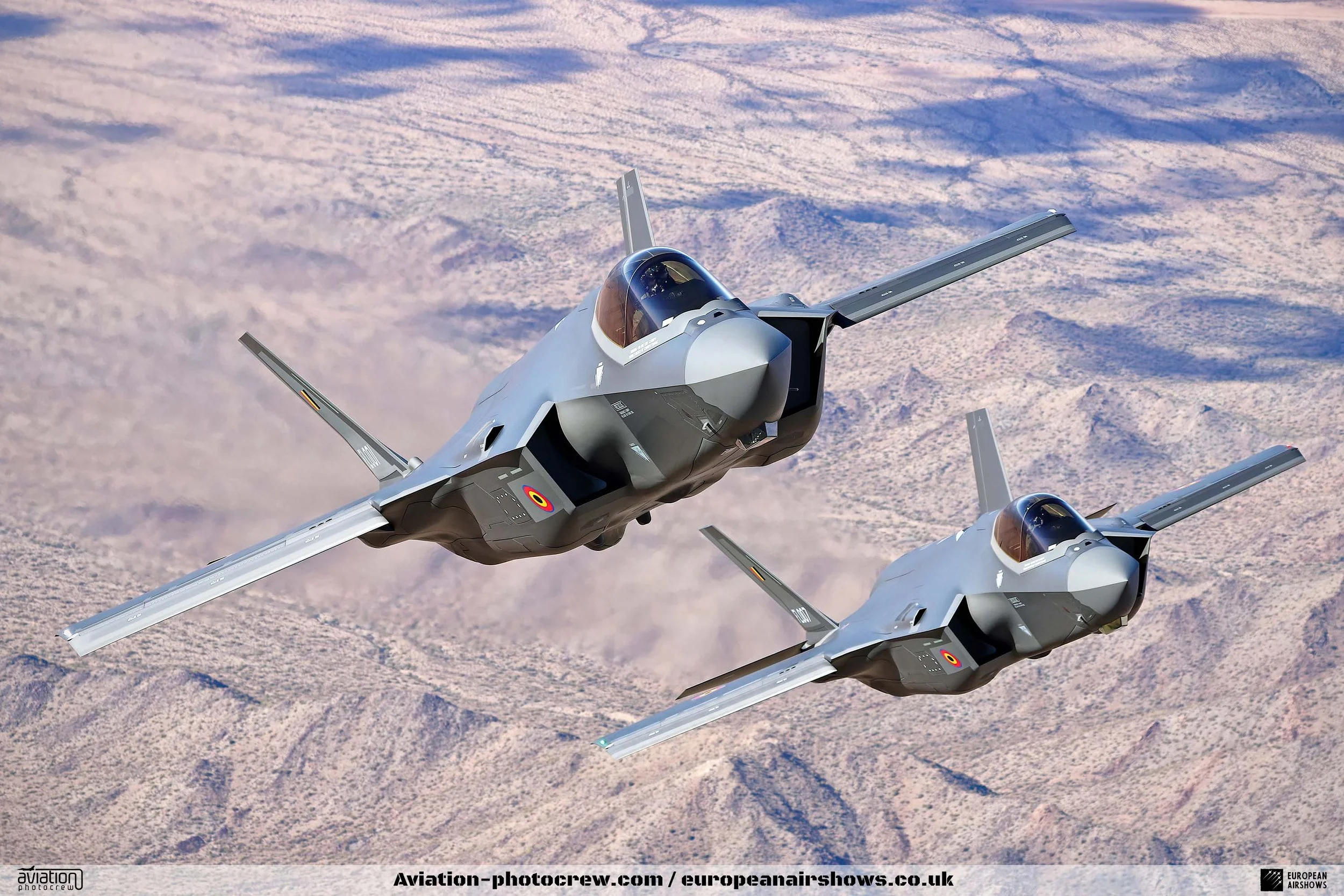 Two Belgian Air Force F-35A Lightning II fighter jets flying in formation during an air-to-air photo.